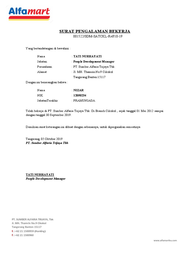 Contoh surat paklaring alfamart pt sumber alfaria trijaya. Posting lebih baru posting lama beranda. Contoh surat paklaring dari perusahaan multinasional. Contoh surat lamaran pt sumber alfaria trijaya have an image associated with the other contoh surat lamaran pt sumber alfaria trijaya in addition it will include a picture of a sort that may be seen in the gallery of contoh surat lamaran pt sumber alfaria trijaya. Sama seperti indomaret, alfamart juga memiliki jumlah karyawan yang banyak. Ada begitu banyak perusahaan ritel di indonesia seperti indomaret dan alfamart. Kamu juga bisa menggunakan surat paklaring sebagai syarat pengajuan beasiswa jalur profesional, demi melanjutkan studi ke jenjang yang lebih tinggi. Paklaring adalah istilah yang ditujukan untuk sesuatu yang berkenaan dengan surat penting diantaranya seperti surat keterangan pengalaman kerja, surat rekomendasi, surat referensi. Pantun badan sehat peredaran darah lancar. Cara mendapatkan legalisir surat pengalaman kerja paklaring. Syarat keluarnya surat keterangan kerja (paklaring) adalah kerja minimal 1 tahun. Pdf contoh surat pengalaman kerja pdf reza harahap academia edu contoh surat pengunduran diri. Kepada yth hrd pt sumber alfaria trijaya.